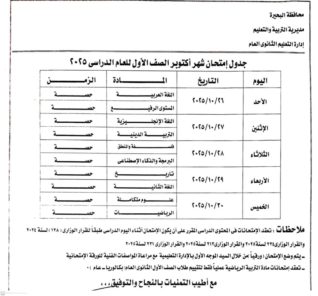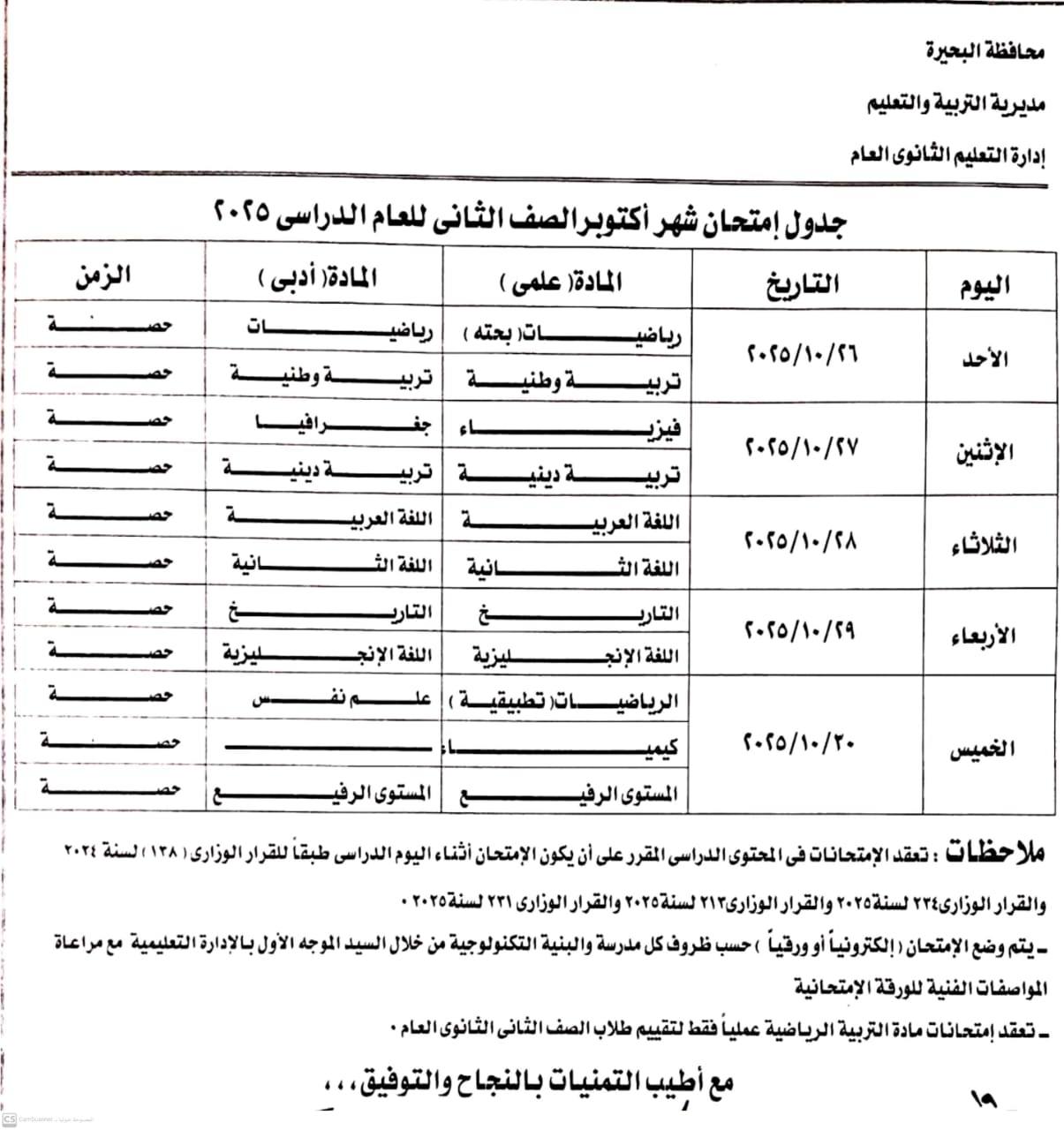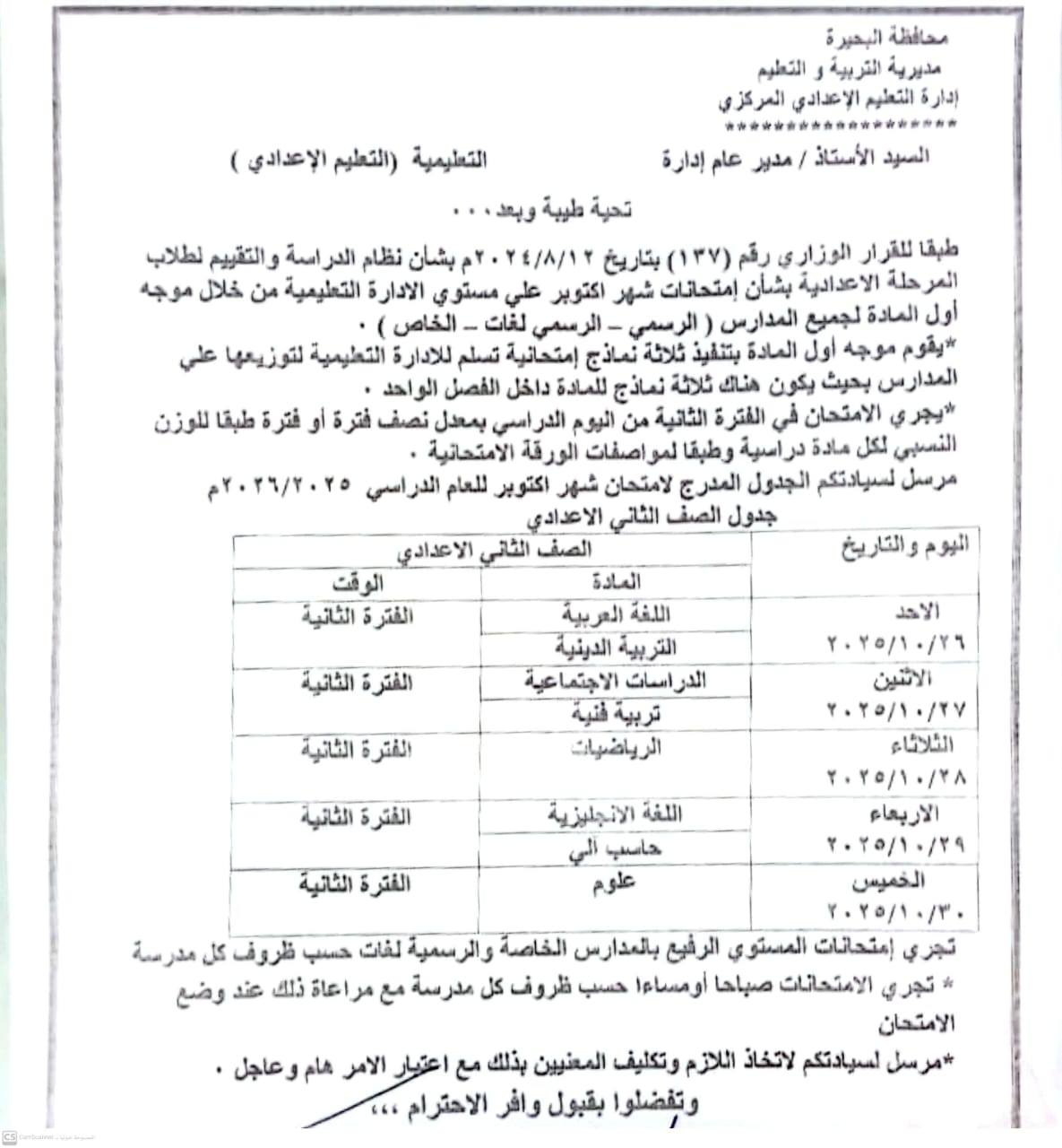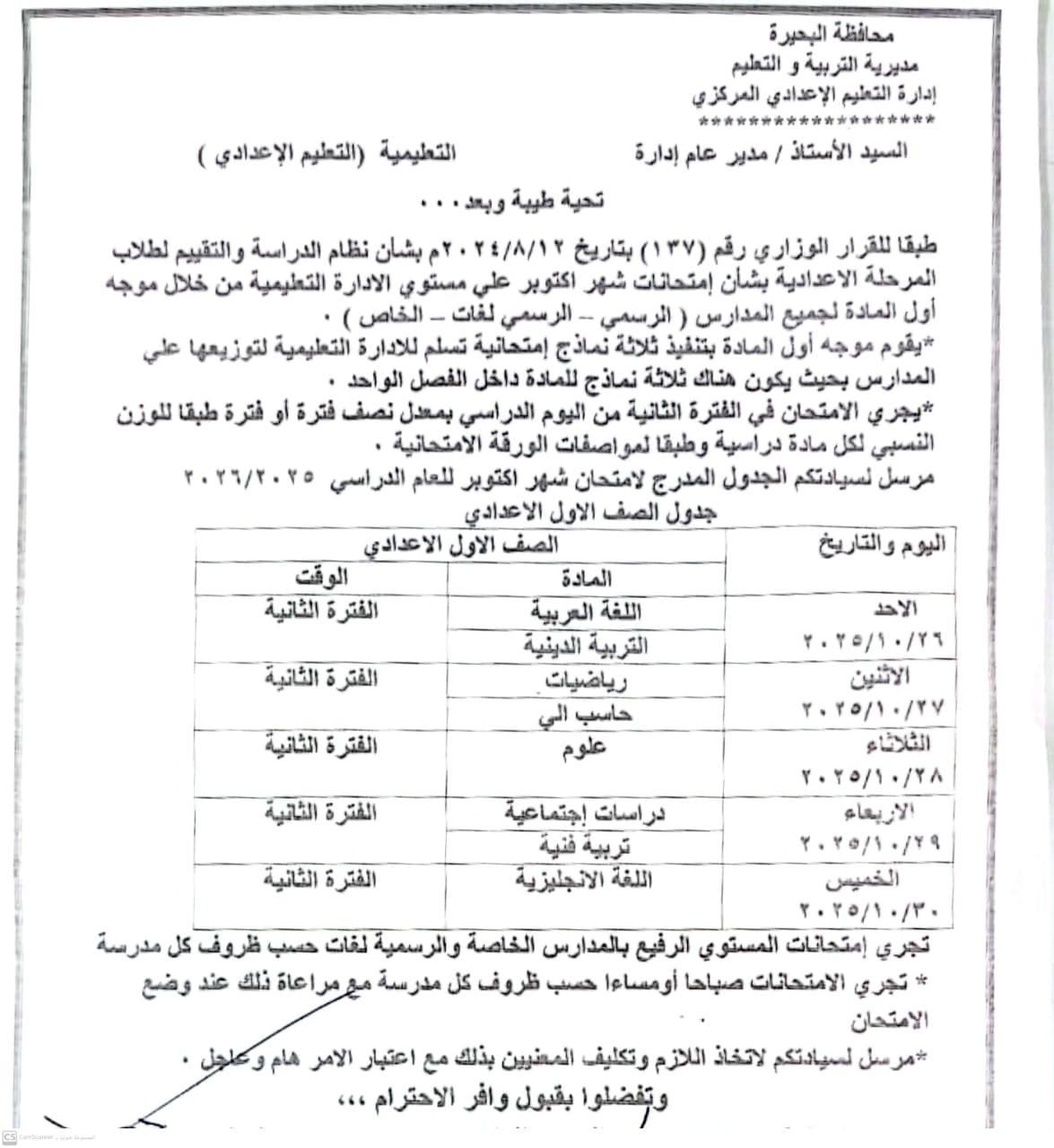 أعلنت مديرية التربية والتعليم بمحافظة البحيرة، جداول امتحانات شهر أكتوبر لصفوف النقل بمراحل التعليم الثلاثة “الابتدائية والإعدادية والثانوية”، للعام الدراسي 2025-2026.