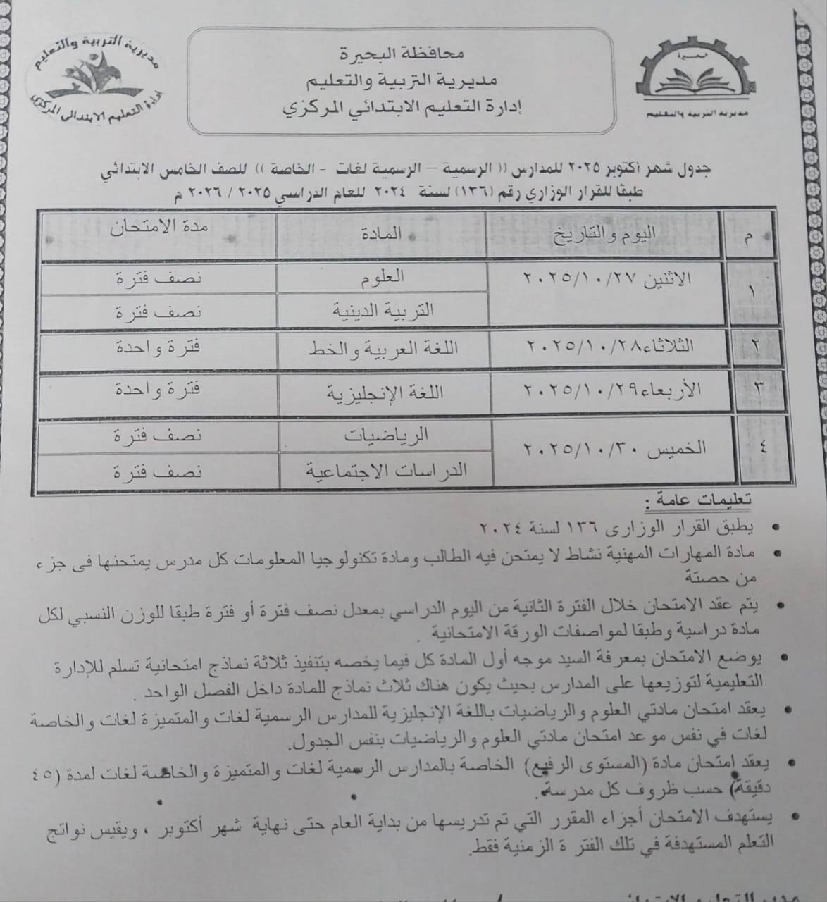 جدول امتحانات شهر أكتوبر 2025 لصفوف النقل البحيرة