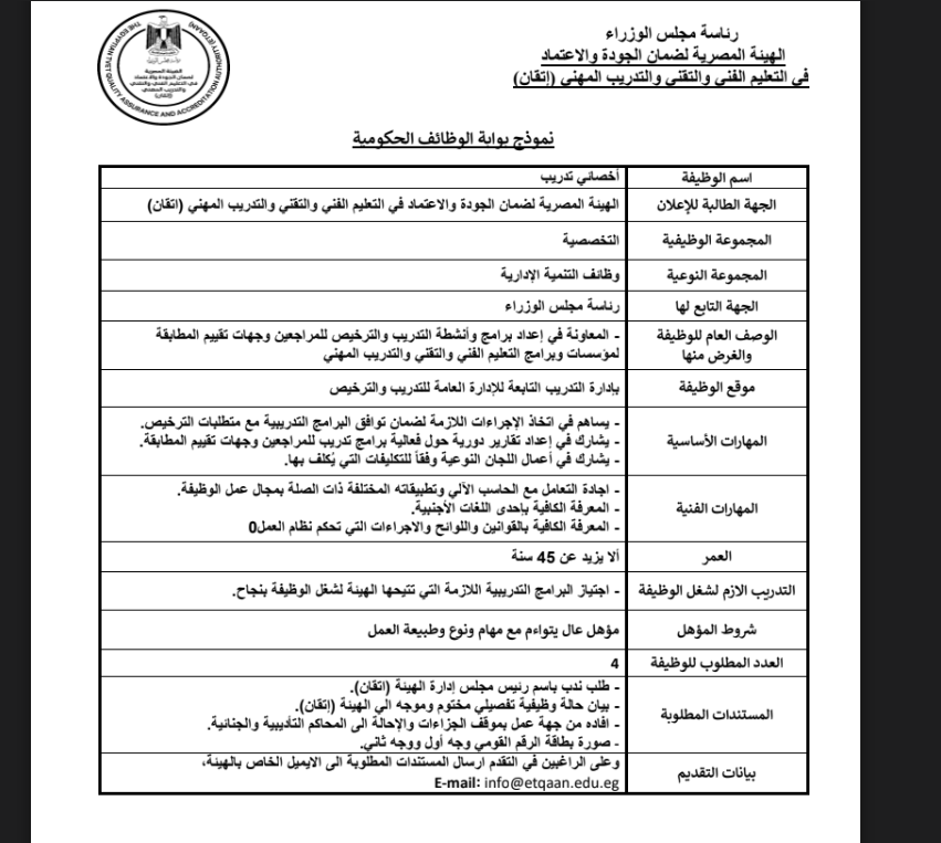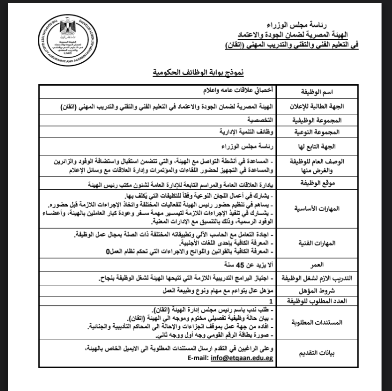 أعلنت الهيئة المصرية لضمان الجودة والاعتماد في التعليم الفني والتقني والتدريب المهني (إتقان) – عن حاجتها لشغل الوظائف التالية وهي وظائف تخصصية عن طريق الندب