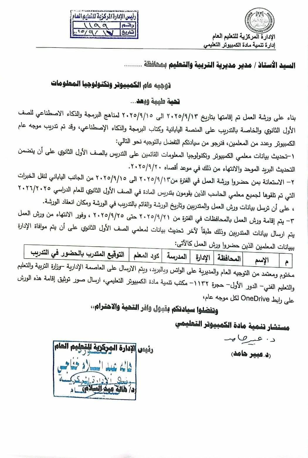 - تحديث بيانات معلمي الكمبيوتر وتكنولوجيا المعلومات القائمين على التدريس بالصف الأول الثانوي على أن يتضمن التحديث البريد الموحد والانتهاء من ذلك في موعد أقصاه ٢٠٢٥/٩/٢٠.