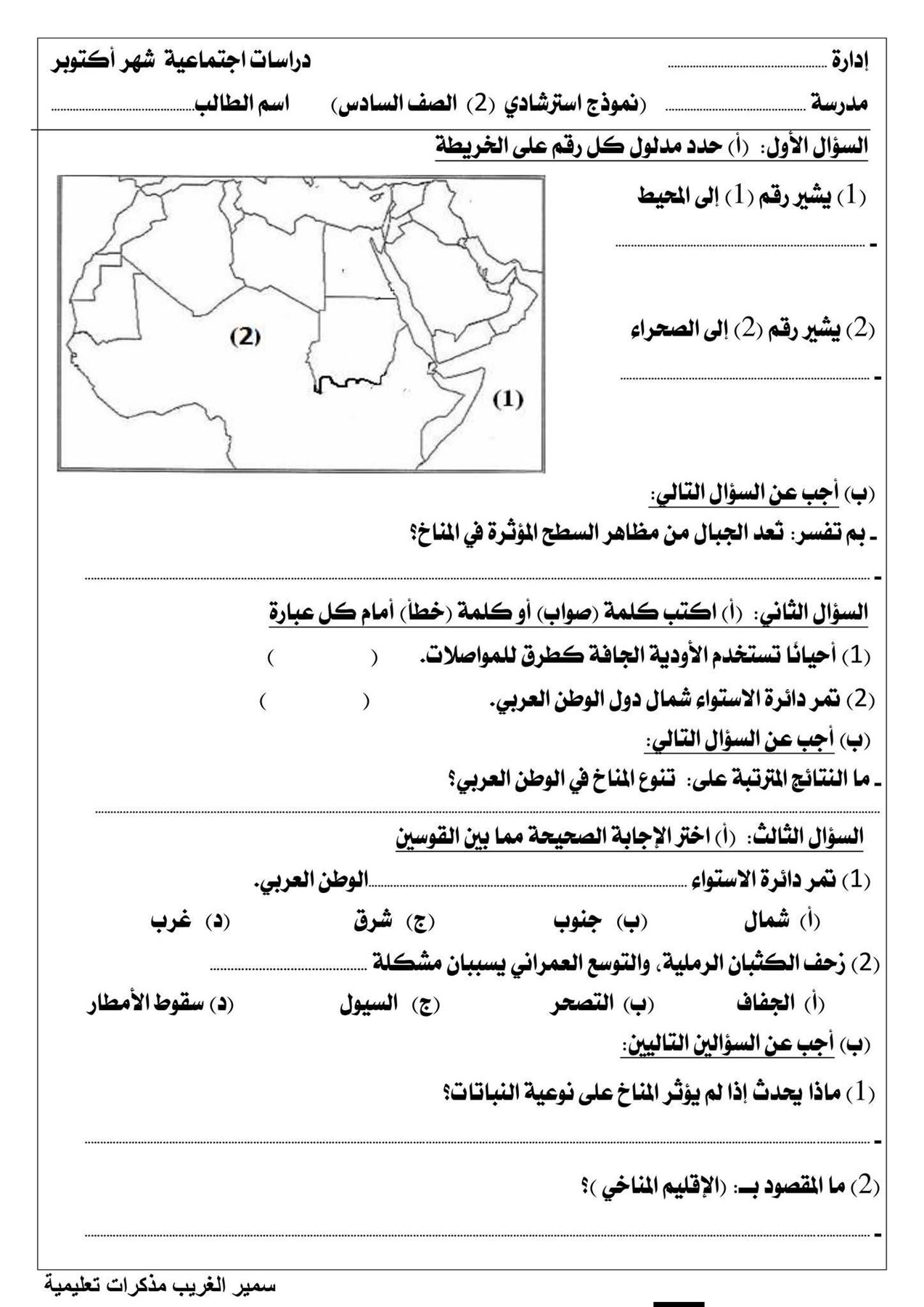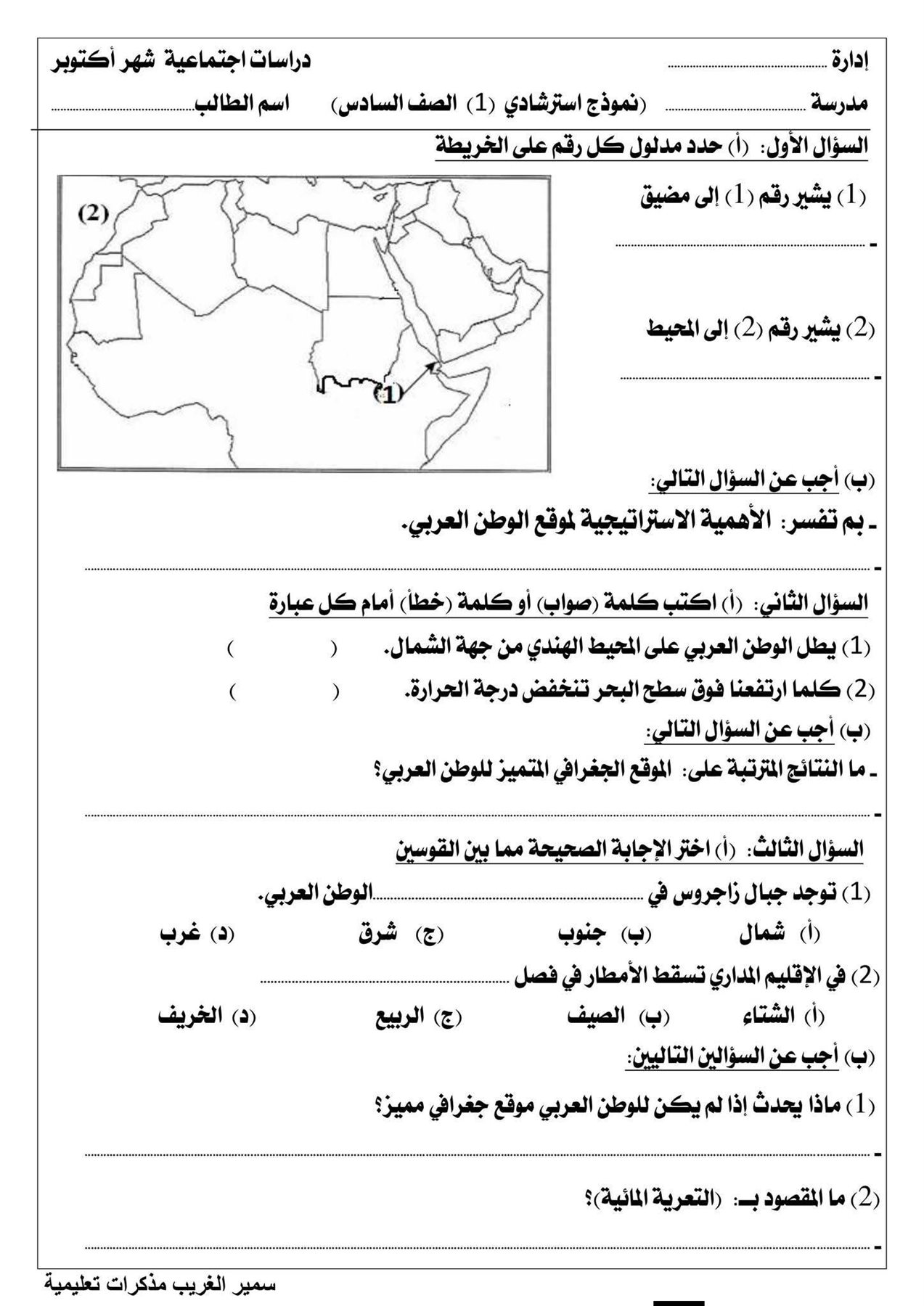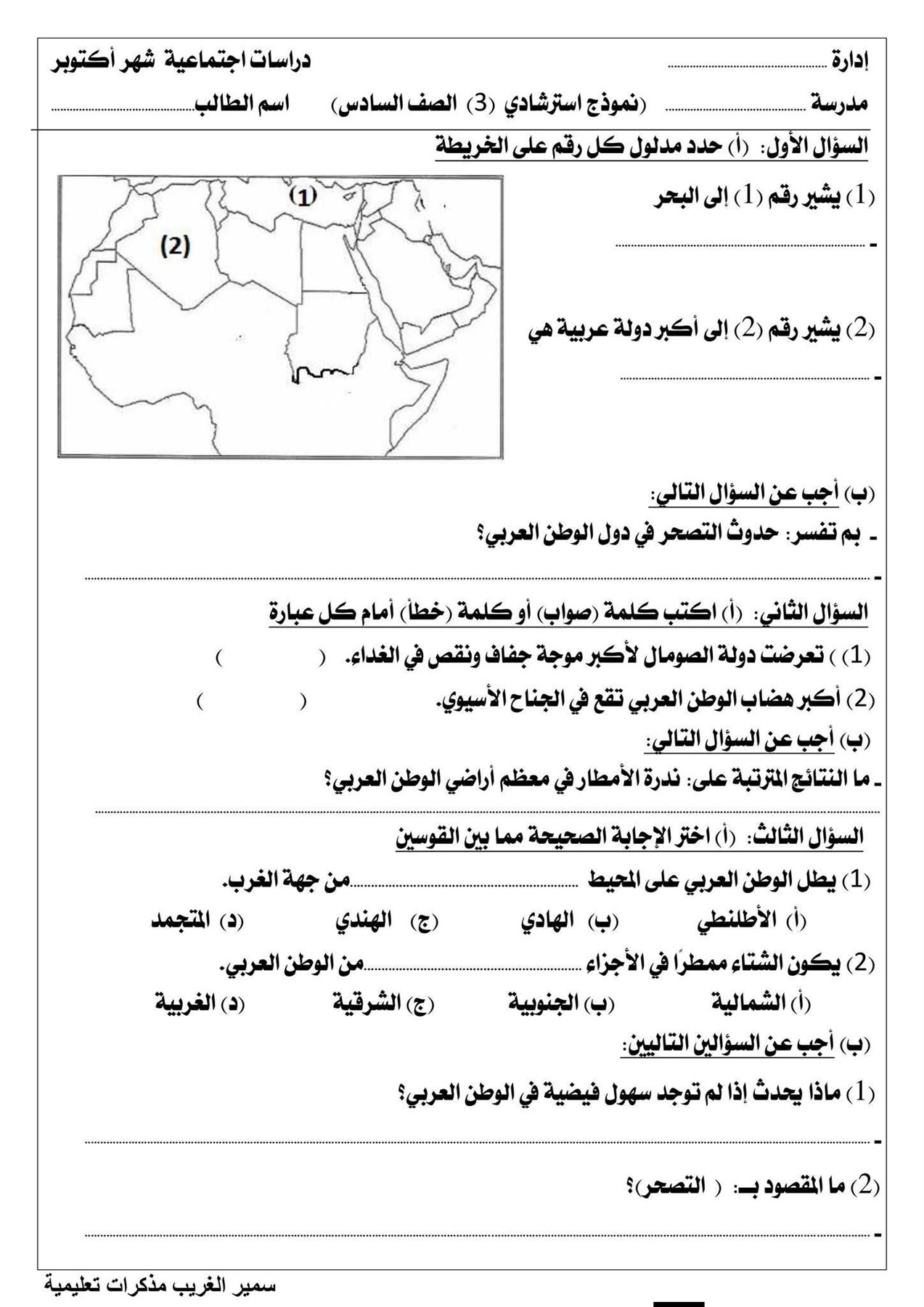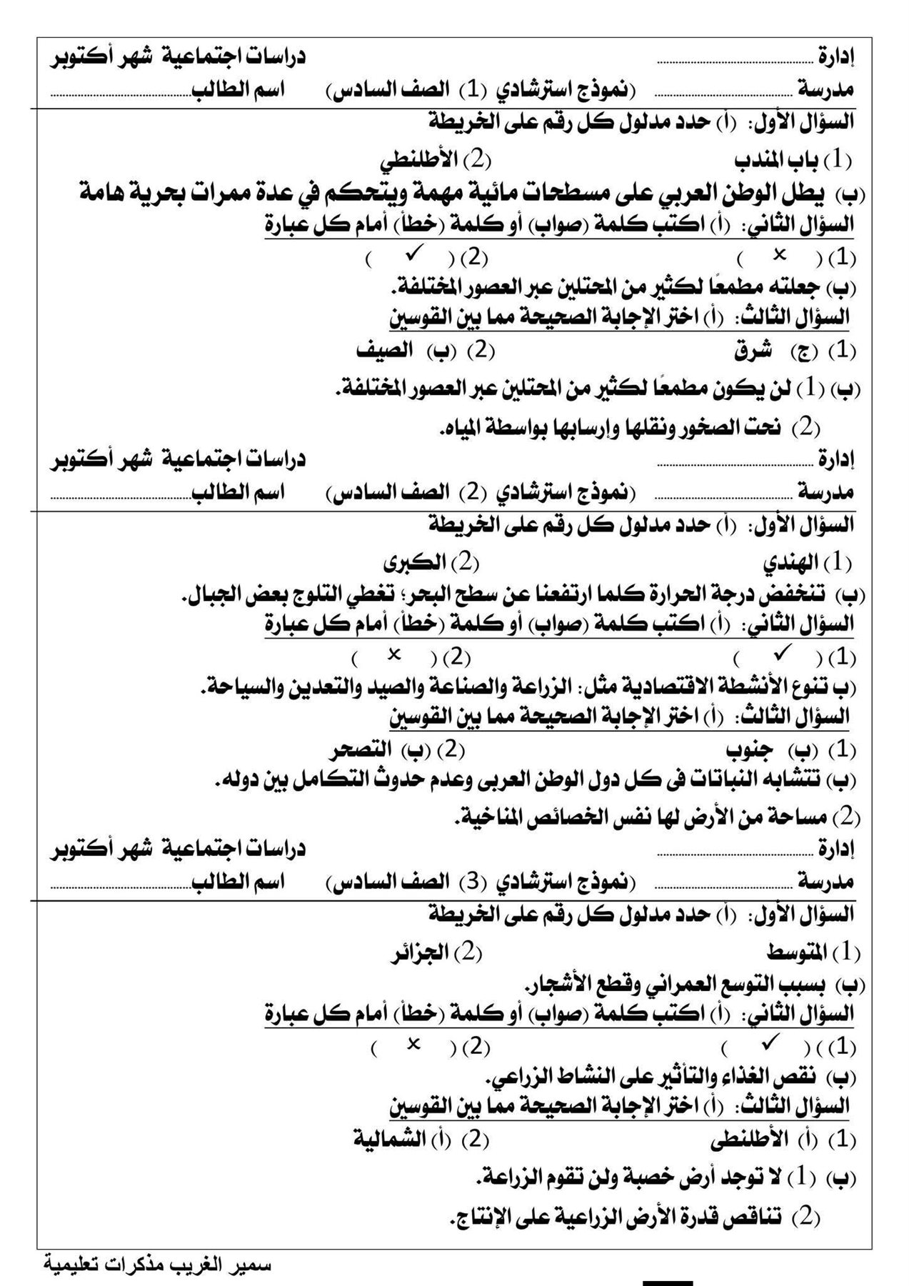 3 نماذج امتحانات شهر أكتوبر 2025 لطلاب السادس الابتدائي بمادة الدراسات الاجتماعية مع الإجابة